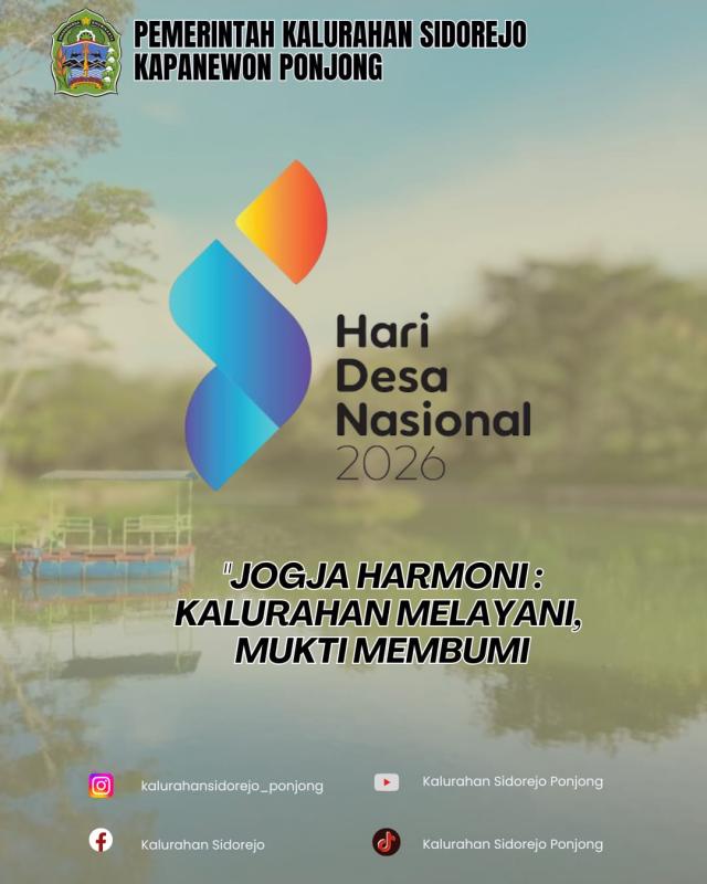 (Sidorejo, 2026) Pemerintah Kalurahan Sidorejo, Kapanewon Ponjong, secara khidmat menyelenggarakan apel peringatan Hari Desa Nasional 2026 pada hari ini, Kamis, 15 Januari 2026. Apel ini dihadiri oleh Lurah Sidorejo, pamong kalurahan, Bhabinkamtibmas serta perwakilan lembaga masyarakat dan mahasiswa KKN Duta Bangsa Surakarta. Pelaksanaan apel ini merujuk pada penetapan 15 Januari sebagai Hari Desa Nasional, memperingati disahkannya Undang-Undang Nomor 6 Tahun 2014 tentang Desa.