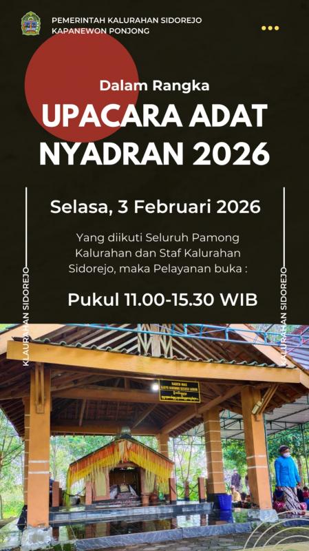 (Sidorejo,2026) Sesuai rapat bersama antara Pemerintah Kalurahan Sidorejo, Lembaga Padukuhan dan Tokoh Masyarakat Padukuhan Blarangan dan Padukuhan Sambirejo pada Selasa, 27 Januari 2026 disepakati pelaksanaan Upacara Adat Nyadran tahun 2026 akan dilaksanakan pada Selasa 3 Februari 2026. Oleh karena itu, seluruh pamong ran staf Kalurahan Sidorejo akan mengikuti acara tersebut, maka pelayanan masyarakat pada Selasa 3 Februari 2026 akan dilayani mulai pukul 11.00-15.30 WIB.